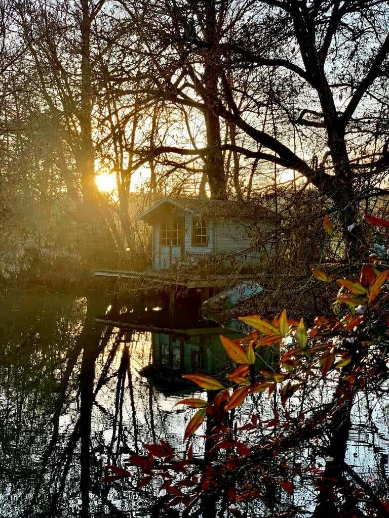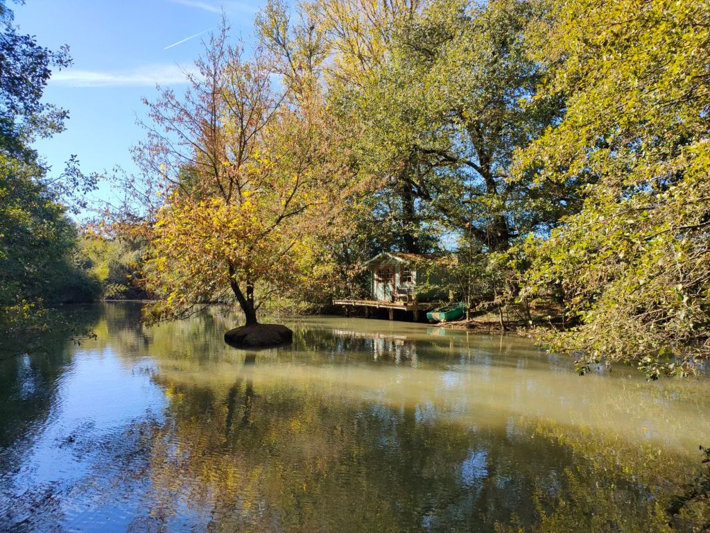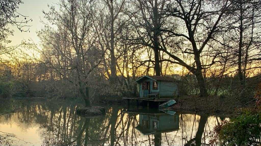 Un double lac où vivent canards sauvages et poules d’eau, bordé par un chalet sur pilotis caché entre les arbres.