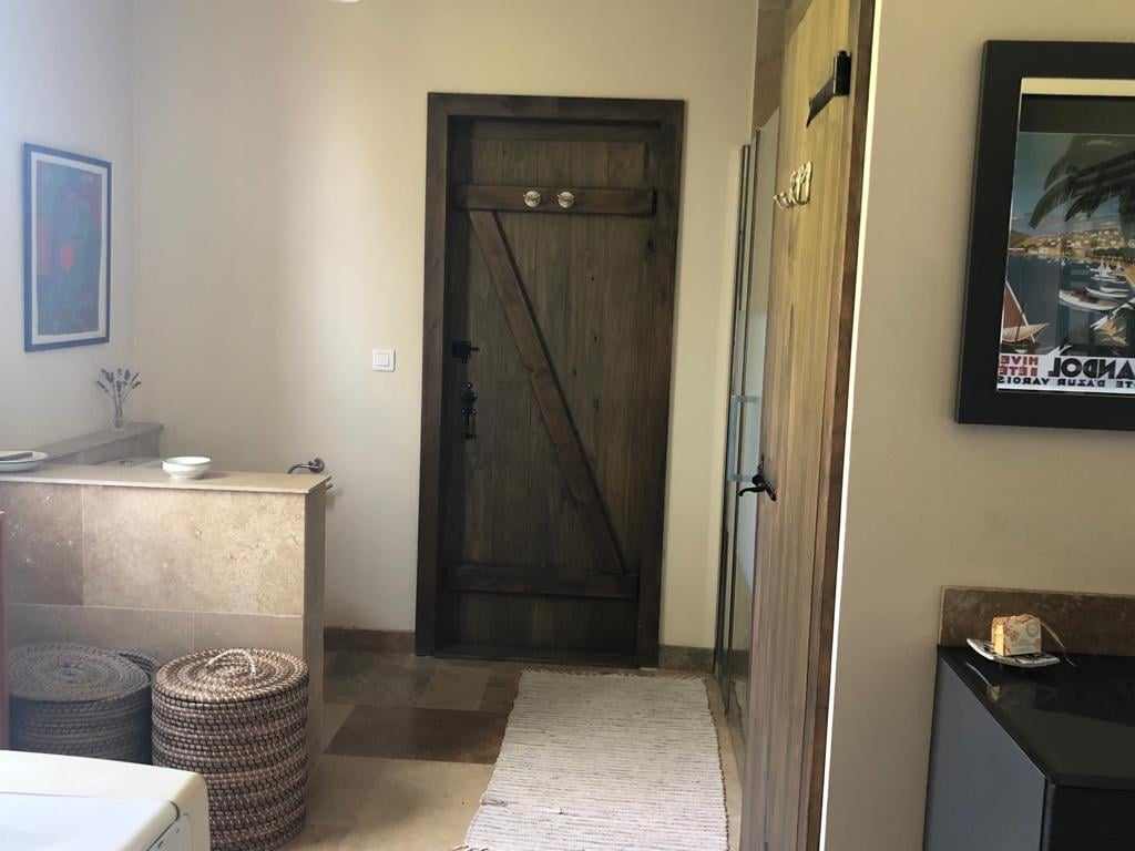 Attenante à la chambre de la rivière, la seconde salle de bain du rez-de-chaussée est spacieuse et comporte un WC, une grande douche, un lave-linge et un sèche-linge, ainsi qu’un sèche-cheveux à disposition.