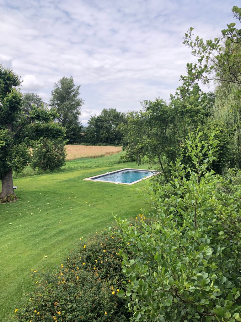 A l’arrière de la maison, un grand jardin avec piscine, ainsi qu’un potager et un verger au fond du jardin.